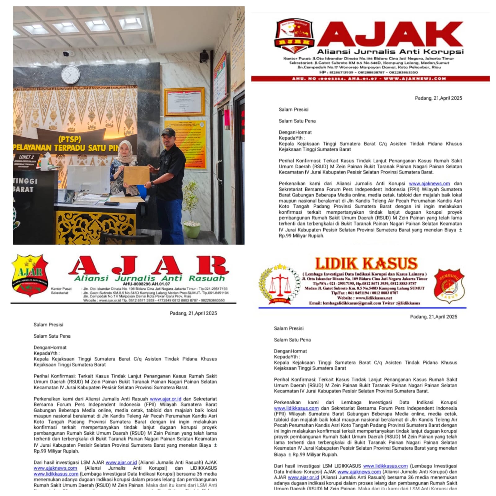 Ketiga Organisasi Anti Korupsi tersebut resmi menyurati Kejati Sumbar dan mempertanyakan tindak lanjut dugaan korupsi proyek pembangunan Rumah Sakit Umum Daerah (RSUD) M Zein Painan yang telah lama terhenti dan terbengkalai di Bukit Taranak Painan Nagari Painan Selatan Kecamatan IV Jurai Kabupaten Pesisir Selatan Provinsi Sumatera Barat yang menelan biaya sebesar ± Rp.99 Miliyar Rupiah.