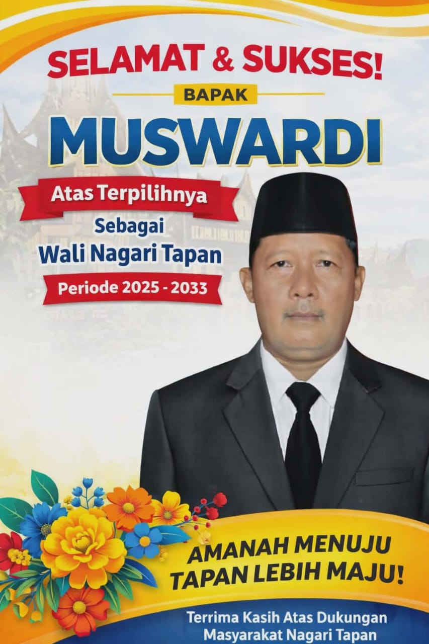 “Kepercayaan ini akan saya jaga sebaik mungkin insyaallah Saya siap mengabdi dan bekerja untuk kemajuan Nagari Tapan kedepannya,” ujar Muswardi/mangku Us
