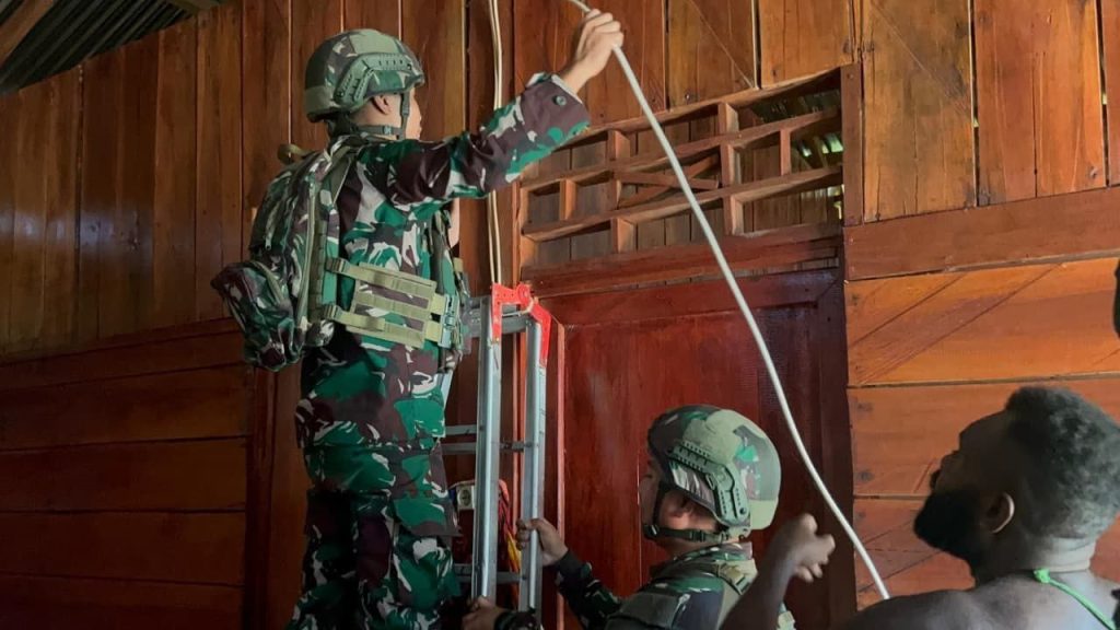 Papua,Sumbar 24jam.com -TNI (Tentara Nasional Indonesia) terlibat aktif dalam berbagai program kelistrikan di Papua melalui kegiatan pembinaan teritorial (binter) Satgas Yonif 521/DY membantu perbaikan instalasi listrik warga yang rusak di Kampung Benawa, Distrik Benawa, Kabupaten Yalimo, papua pegunungan di rumah salah satu warga.
