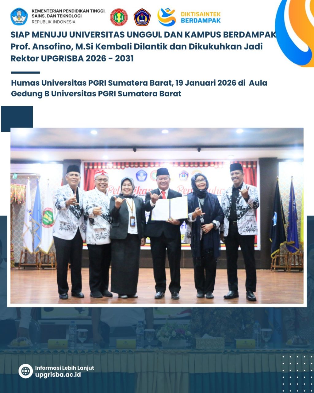 SIAP MENUJU UNIVERSITAS UNGGUL DAN KAMPUS BERDAMPAK* Prof. Dr. Ansofino, M.Si Kembali Dilantik dan Dikukuhkan Jadi Rektor UPGRISBA 2026 – 2031 1 min read SIAP MENUJU UNIVERSITAS UNGGUL DAN KAMPUS BERDAMPAK* Prof. Dr. Ansofino, M.Si Kembali Dilantik dan Dikukuhkan Jadi Rektor UPGRISBA 2026 – 2031 PADANG – Bapak Prof. Dr. Ansofino, M.Si. kembali dilantik dan dikukuhkan sebagai Rektor Universitas PGRI Sumatera Barat...Selengkapnya....