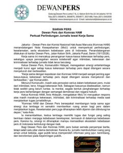 “Komnas HAM dan Dewan Pers sepakat membangun kerja sama yang lebih kuat agar pers memiliki ruang aman dalam menjalankan tugasnya. Keselamatan jurnalis harus dijamin, sekarang dan ke depan,” terangnya Anis.
