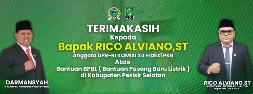 Ketua DPRD Kabupaten Pesisir Selatan Darmansyah dari Partai Kebangkitan Bangsa ( PKB) Dapil 5, atas nama pribadi dan kader partai PKB Kabupaten Pesisir Selatan, bersama seluruh anggota DPRD Kabupaten Pessel Fraksi PKB, mengucapkan terima kasih, serta apresiasi pada anggota DPR RI Komisi VIII Fraksi PKB Rico Alviano, ST telah membawa program Bantuan Pasang Baru Listrik ( BPBL) di Kabupaten Pesisir Selatan.