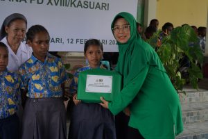 Wakil Ketua Persit KCK Daerah XVIII/Kasuari, Ny. Lilis Dian Hardiana, saat membacakan sambutan Ketua Persit KCK Daerah XVIII/Kasuari, menyampaikan pesan agar anak-anak terus semangat belajar, menjaga sikap, serta menata masa depan dengan penuh harapan. Melalui kegiatan ini diharapkan terbangun kebersamaan yang membawa manfaat bagi semua.