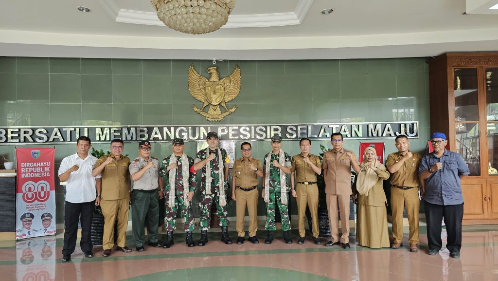 Sebelum rombongan menuju lokasi TMMD di Kecamatan Bayang, Kabupaten Pesisir Selatan, Tim Wasev Brigjen TNI Gustiwardana, dan Kasiter Korem 032/Wirabraja Letkol Kav.Dicko Irawan bersilahturahmi dengan Pemkab Pesisir Selatan, diterima Bupati diwakili Wakili Bupati Pesisir Selatan H. Risnaldi Ibrahim. Hadir juga kepala OPD terkait.