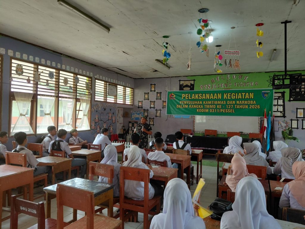 Sumbar24jam.com|Pessel-TMMD Ke 127 Kodim 0311/Pessel melaksanakan penyuluhan keamanan dan ketertiban masyarakat serta bahaya narkoba di lingkungan masyarakat di bagi Siswa dan soswi SMAN 1 Bayang, pada Senin ( 23/2/2026 ).