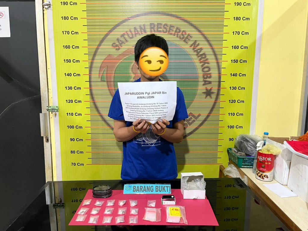 Selanjutnya dipanggil saksi-saksi untuk menyaksikan penggeledahan. Hasil dari penggeledahan terhadap badan, pakaian, serta rumah tersangka ditemukan dompet kecil di saku celana tersangka yang berisi 15 paket sabu,Selain itu satu unit handphone Oppo turut diamankan dari tangan tersangka.