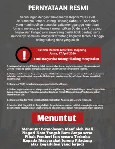 Limapuluh Kota,Sumbar24jam.com – jumat,17 April 2026 — Heboh ditengah masyarakat serta menarik perhatian diJorong Piladang, Sumatera Barat, para pemuda,tokoh masyarakat serta Ninik mamak mengeluarkan pernyataan resmi menyikapi polemik yang timbul akibat pelaksanaan kegiatan Kopdar YKCS XVIII yang digelar pada Sabtu, 11 April 2026 di wilayah tersebut.